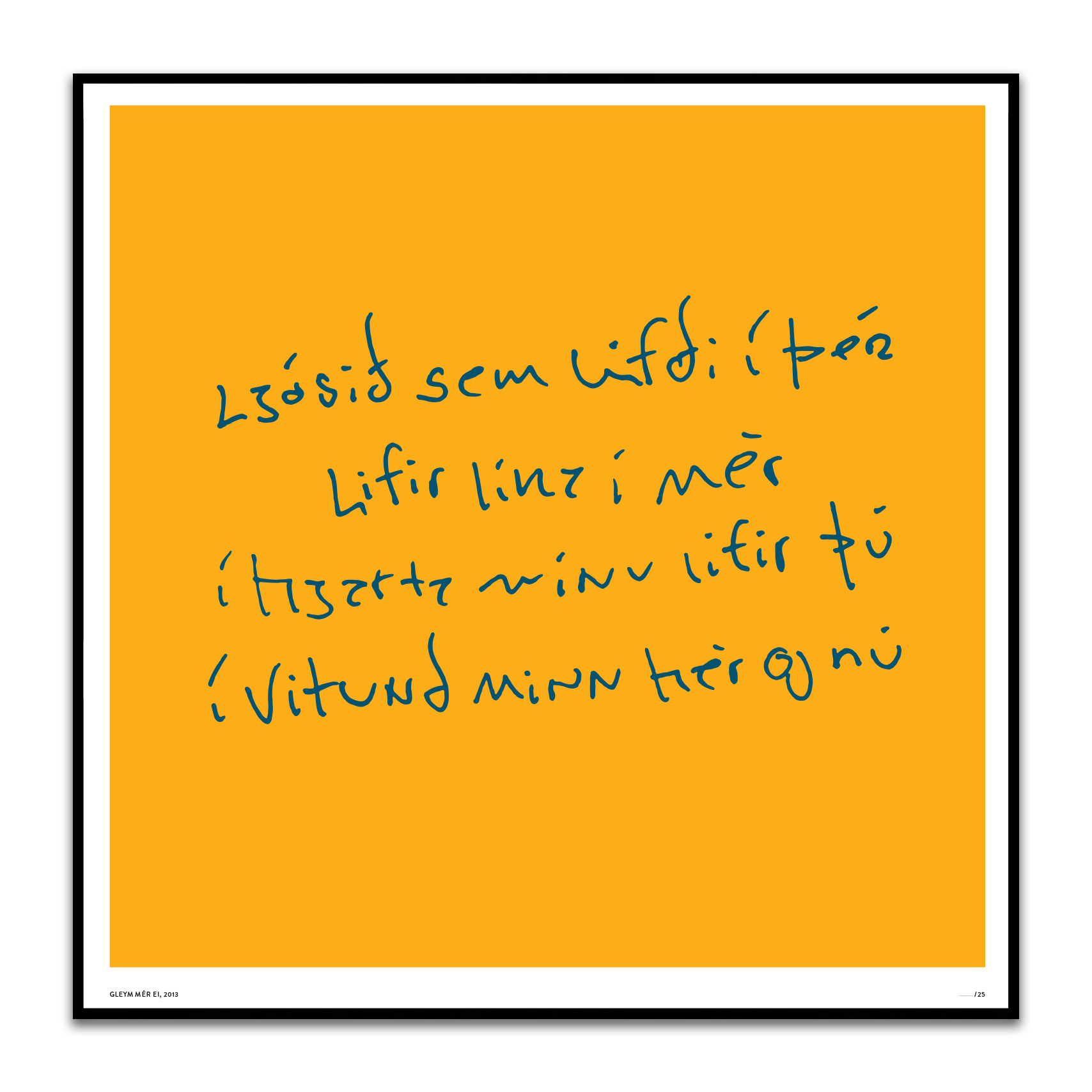 Ljósið sem lifði í þér lifir líka í mér, í hjarta mínu lifir þú, í vitund minni hér og nú úr laginu Gleym mér ei, stærð 30×30